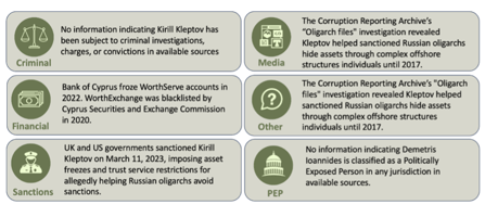 - Risk categories: Statements are organized by PEP status, sanctions exposure, adverse media, and legal issues